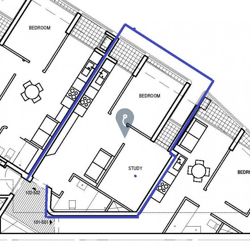 The layout features a bright, open-plan kitchen, living and dining area, a main bathroom, a spacious bedroom, and an additional study, making it versatile enough to be used as a one-bedroom apartment with a dedicated work-from-home space.