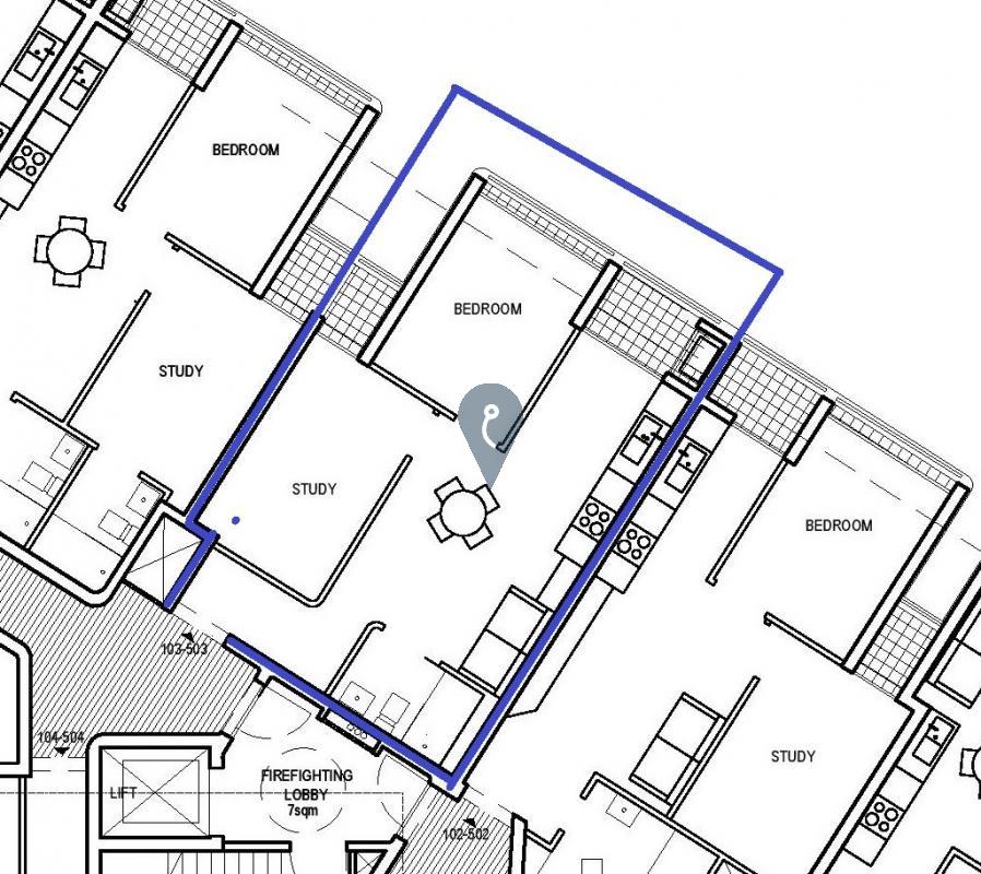 The layout features a bright, open-plan kitchen, living and dining area, a main bathroom, a spacious bedroom, and an additional study, making it versatile enough to be used as a one-bedroom apartment with a dedicated work-from-home space.