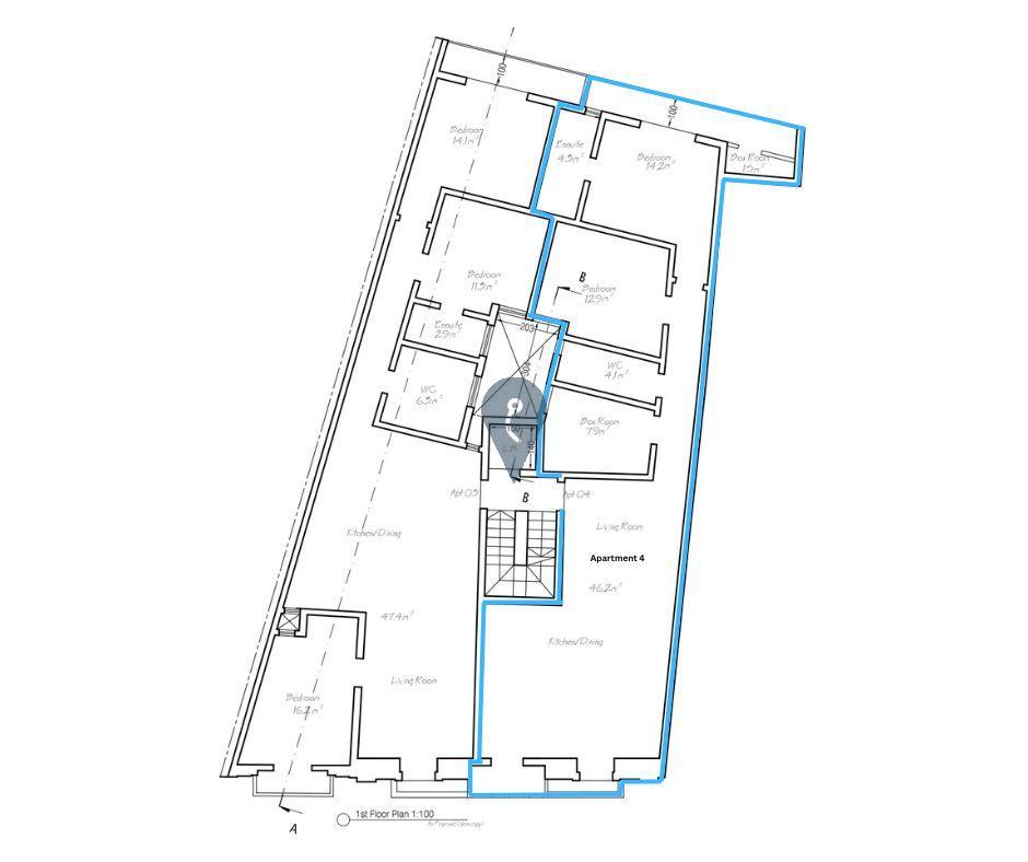 This first-floor apartment comprises two bedrooms, one ensuite, a main bathroom, a box room, a back balcony with a small storage space, and a traditional front balcony. Served with a lift, finished common parts included in the price.