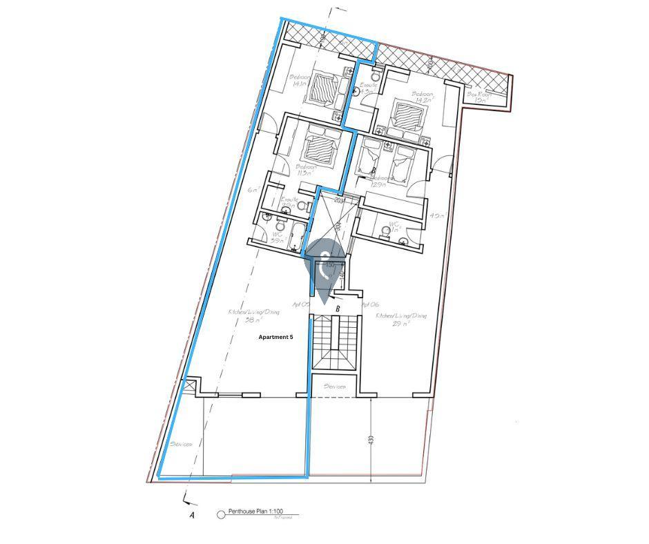 This second-floor Penthouse comprises two bedrooms, one ensuite, a main bathroom, a front terrace, and a back balcony. Served with a lift, finished common parts included in the price.