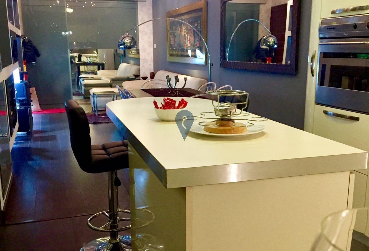 The apartment features an open-plan kitchen, living and dining area, a bathroom with a bath and sound system, a laundry room, and a split-level bedroom that includes a dedicated workspace or study area.