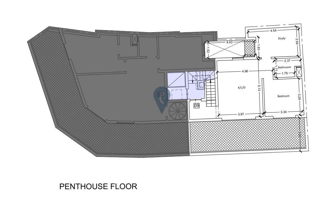 The penthouse comprises a generous main bedroom, a study perfect for remote work or a second bedroom, and a main bathroom. The open, airy layout maximizes natural light, creating a welcoming atmosphere throughout. Outside, you'll find a front terrace ideal for morning coffee and evening relaxation, plus a private rooftop pool and deck area where you can enjoy distant sea views from your own sanctuary. Optional street-level garages are available, and the property comes with finished common parts and freehold ownership. Finishing package available on request.