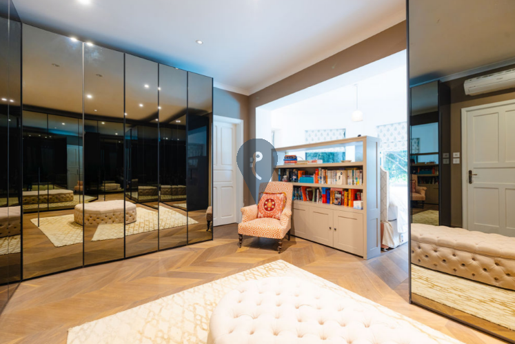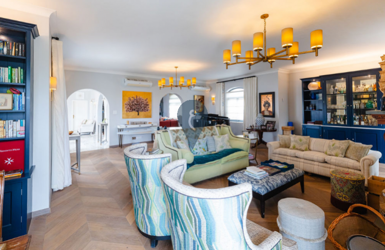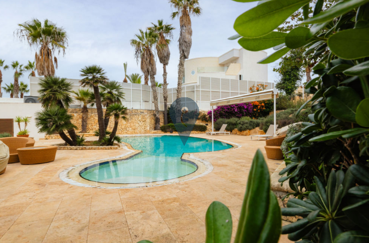 The outdoor areas are equally impressive. A beautifully arranged lounge and deck area surrounds the substantial swimming pool, all set within a lush, mature garden that enhances the property’s sense of calm and seclusion. Whether hosting gatherings or simply basking in the Mediterranean sun, this outdoor space is designed for enjoyment.