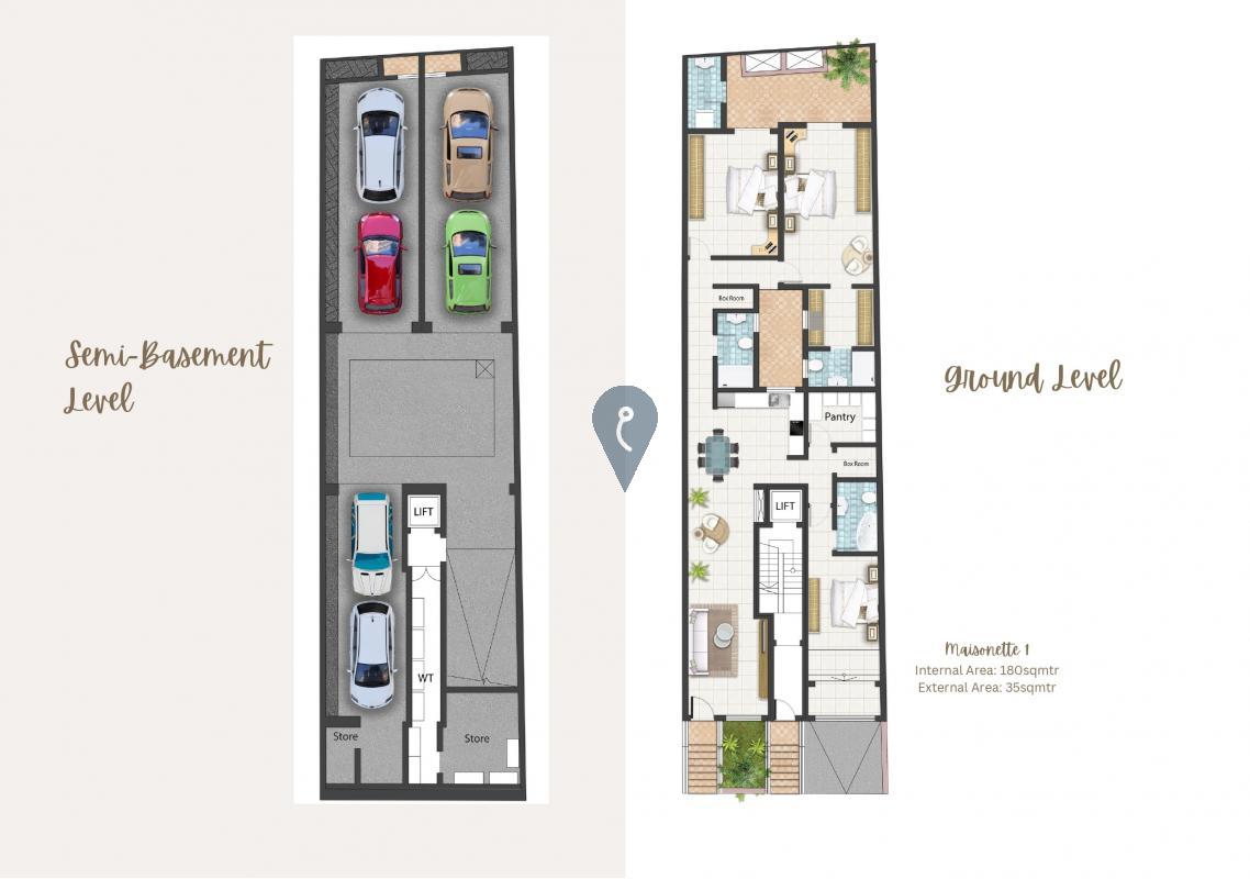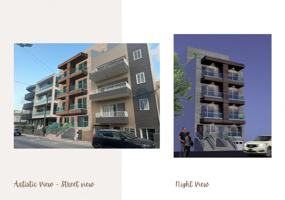 A two-car semi-basement garage is being offered in a newly built block, which is also offering a three-bedroom maisonette, seven two-bedroom apartments, and a three-bedroom penthouse, all finished to high standards. Units feature polished gres tiles with skirting, white aluminium double-glazed apertures, glass balconies, a Travertine facade, and white-painted interiors.