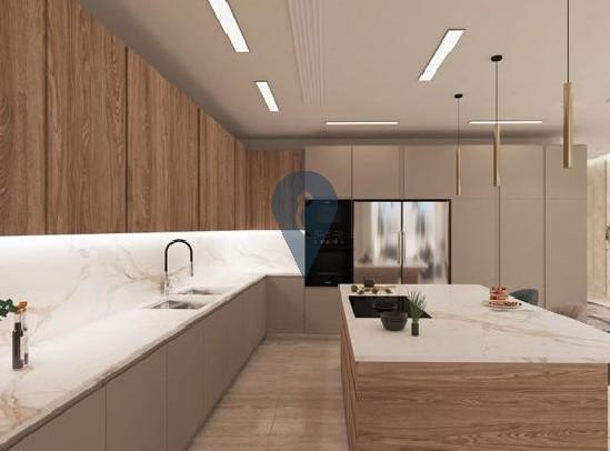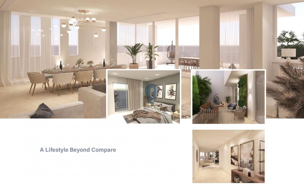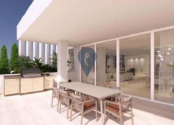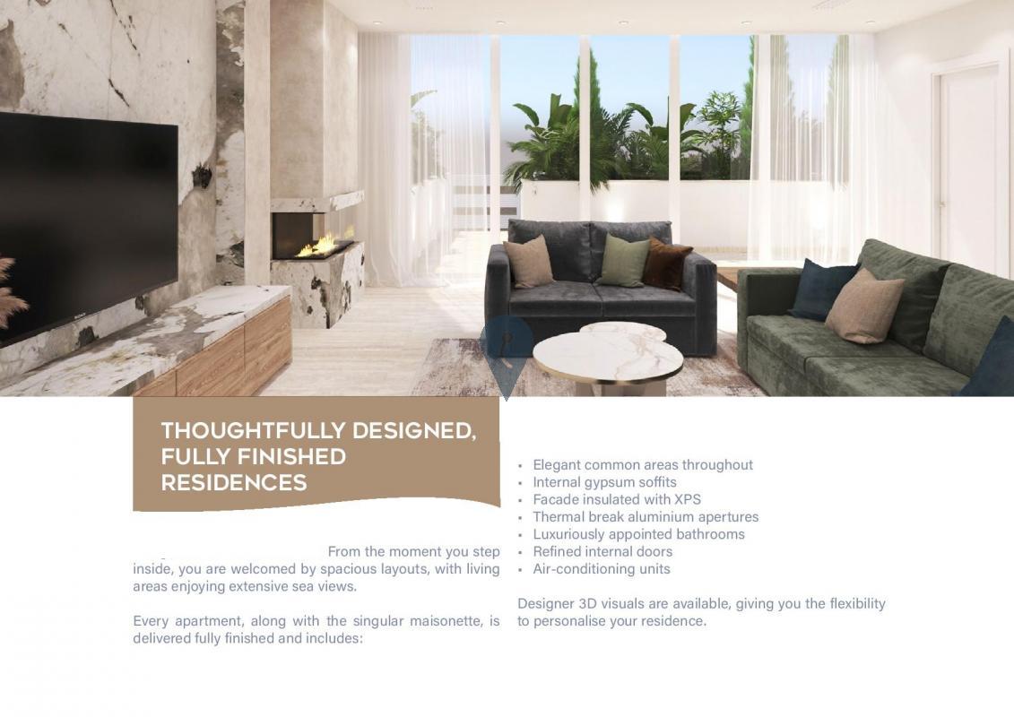 The layout features a bright and spacious open-plan kitchen, living and dining area leading onto large terraces, three well-appointed double bedrooms, and four bathrooms. High-quality finishing is provided throughout, including gypsum soffits, thermal break apertures, air-conditioning units, refined internal doors, and luxury bathrooms.