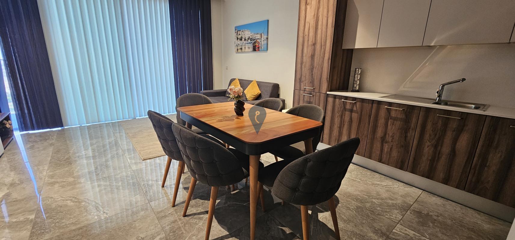 This high-floor apartment enjoys panoramic views of the island and the Mediterranean Sea, combining world-class design with everyday comfort. The interior layout features an open-plan kitchen, living and dining area, a spacious double bedroom, and a stylish main bathroom – all finished to the highest standards and being offered fully furnished.
