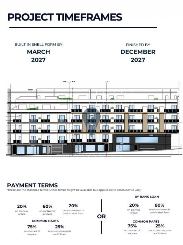PAOLA - Brand NEW corner development with a large selection of Apartments, Penthouses, Shops, Garages and car spaces. The layout comprises an open plan leading to an outdoor area - terrace/balcony, main bathroom, main bedrooms, and an extra room that can be used as the second bedroom, study, or gym. The property is being offered in advanced shell form with the common parts finished, including lift and also the apartment's external apertures and balconies, water tank, and services till the shaft. The project is expected to be built as a shell by March 2026 and finished by December 2027. Freehold. Contact us for more information on viewings.
