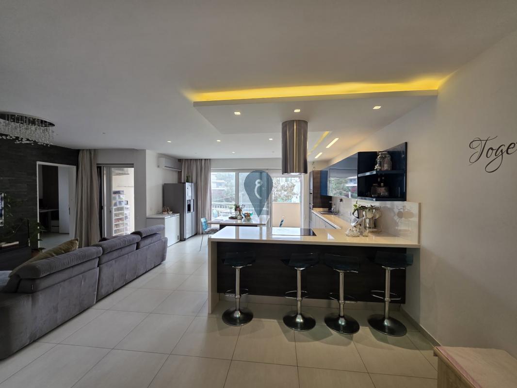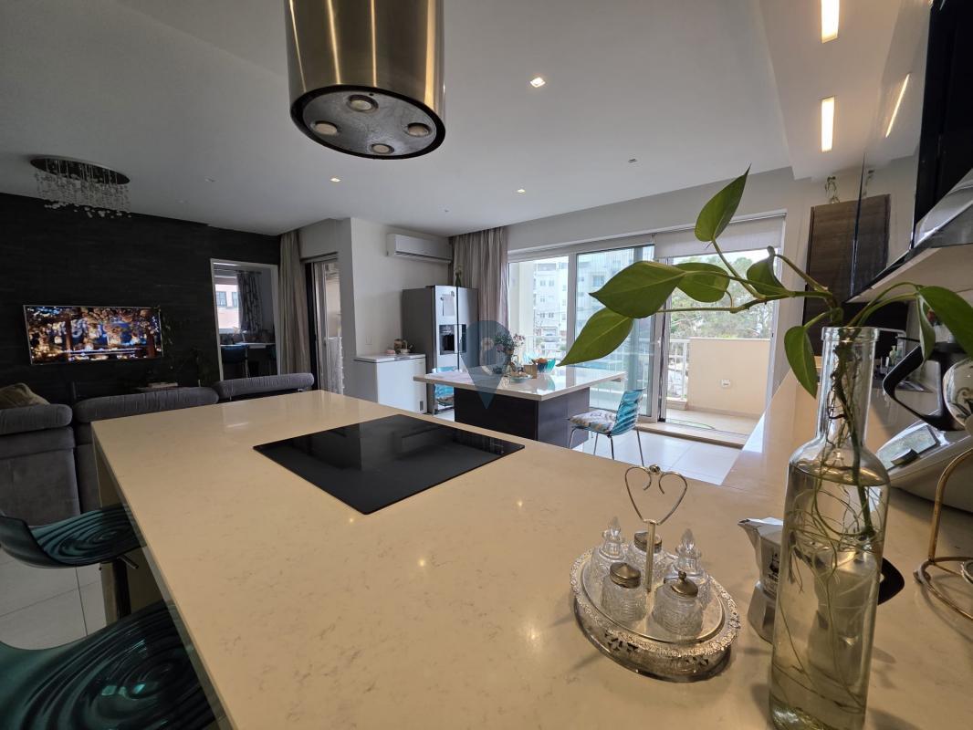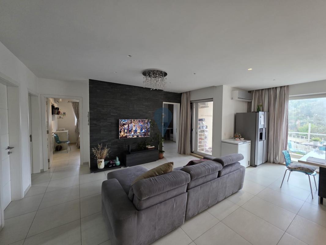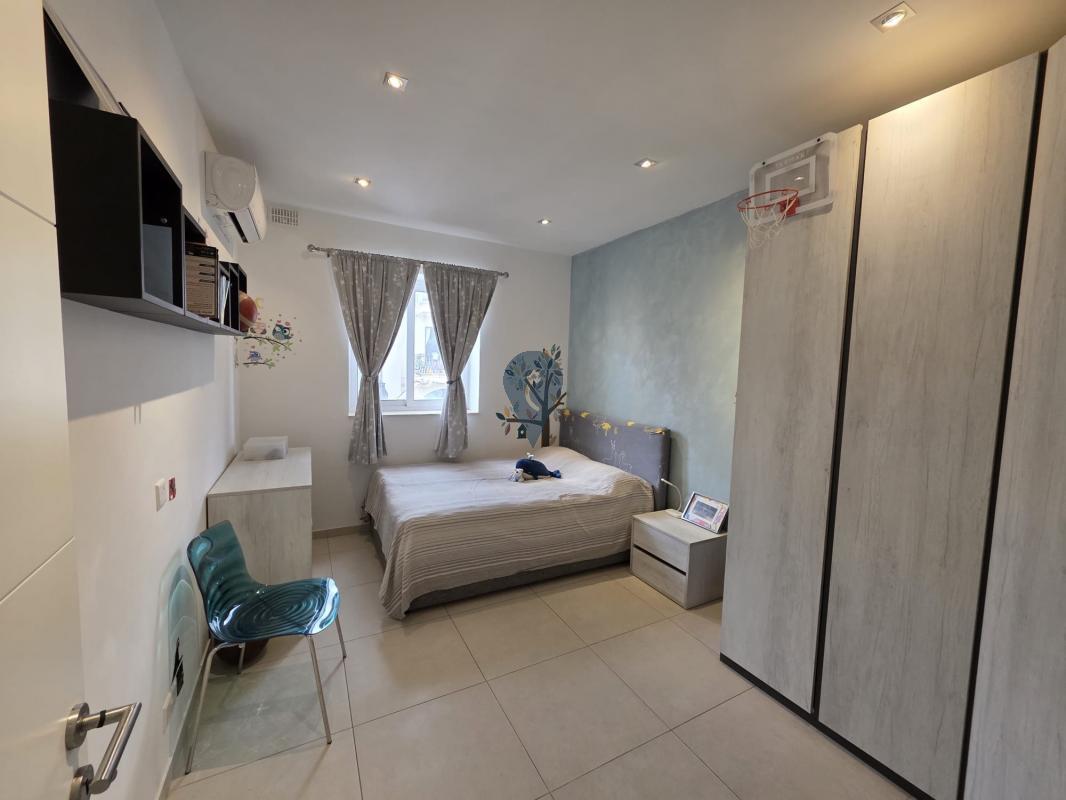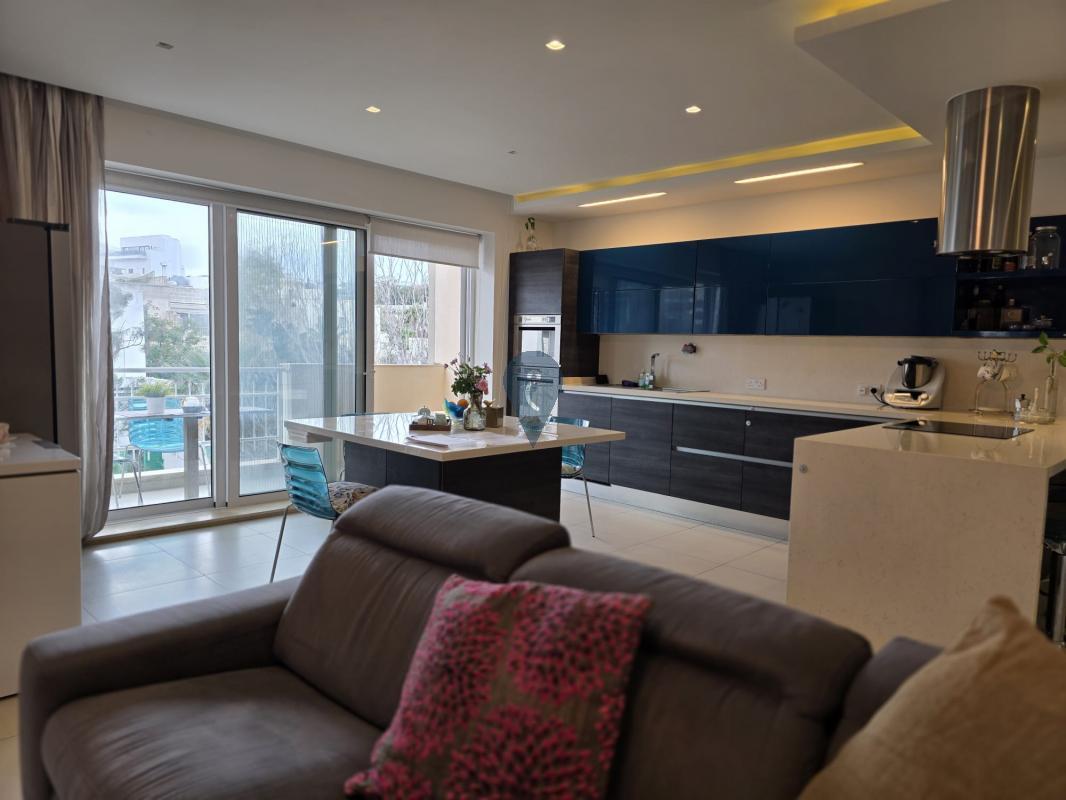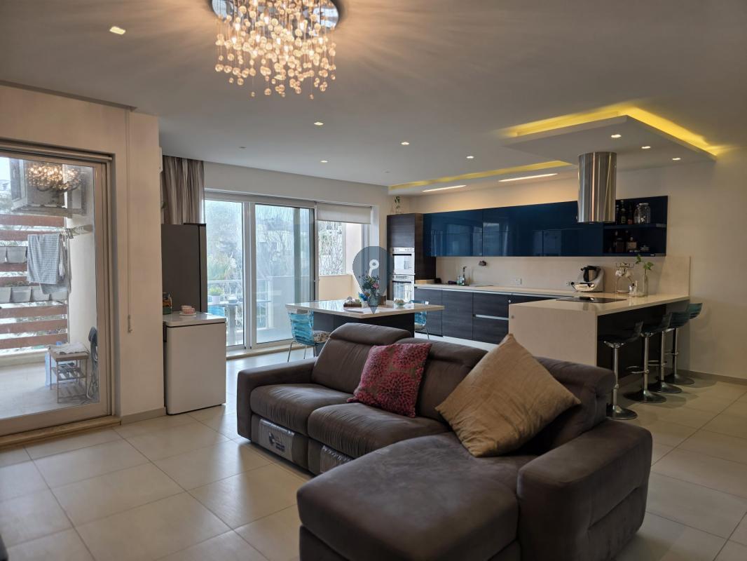Swieqi offers a three-bedroom apartment, featuring a square layout and sold furnished. It includes an open-plan kitchen, living, and dining area, a box room for additional storage, and three double bedrooms, with the main bedroom having an ensuite bathroom. This corner apartment is filled with natural light and has a balcony accessible from the kitchen, living area, and one of the bedrooms. Additionally, there is a one-car garage at street level.