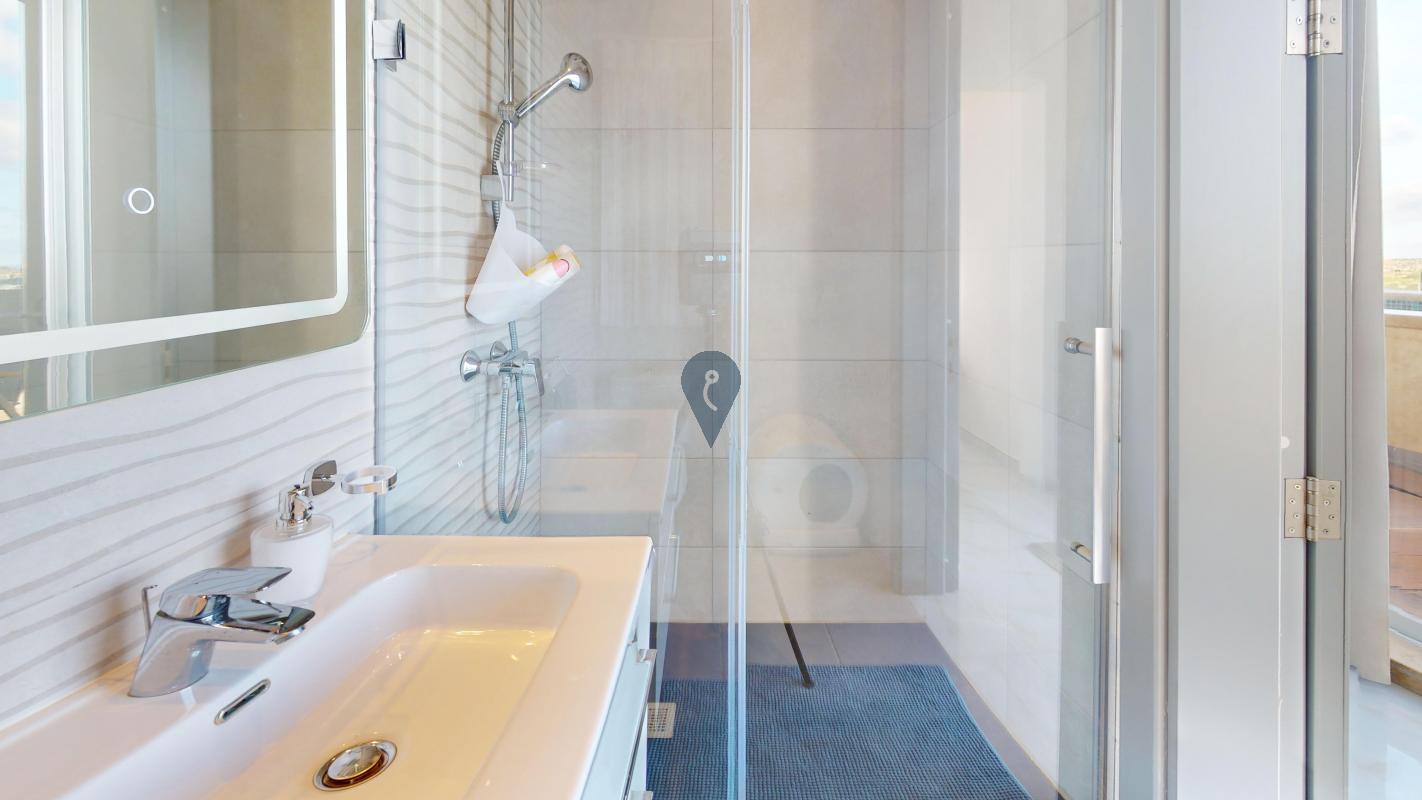 The open-plan kitchen, living, and dining area flows onto an impressive terrace with breathtaking views, providing an ideal space for entertaining and everyday living. The property boasts three bedrooms, including a master suite with an en-suite shower, alongside a main bathroom. The upper level, accessible via an internal staircase or lift, features a washroom with a kitchenette, a cozy living area with a sofa bed, and an additional shower room.