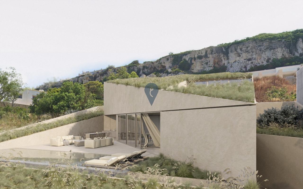 Both villas are defined by clean horizontal lines, soft mineral finishes, and a restrained material palette that reflects the colours of the surrounding landscape. The built forms are layered and partially embedded into the site, with green roofs and landscaped terraces that soften the architecture and enhance the sense of continuity between the natural and built environments.