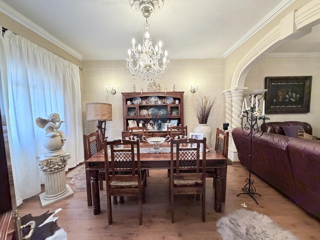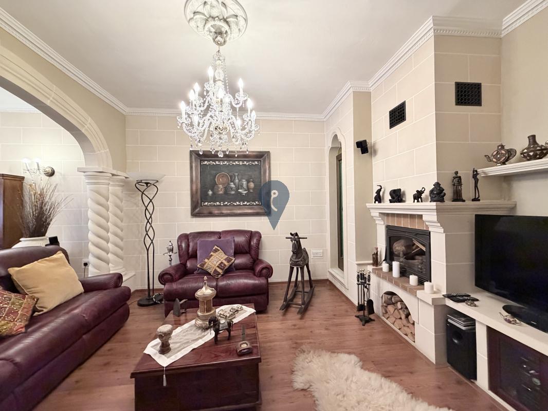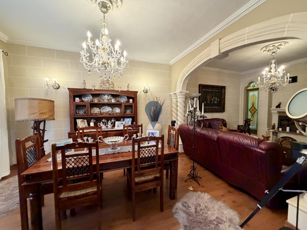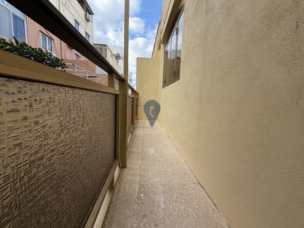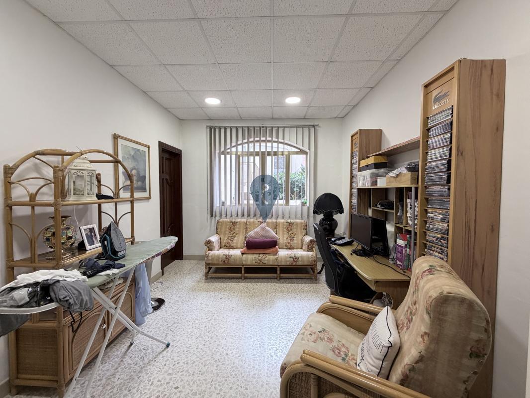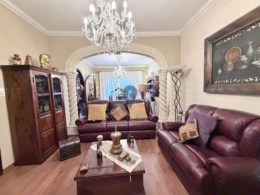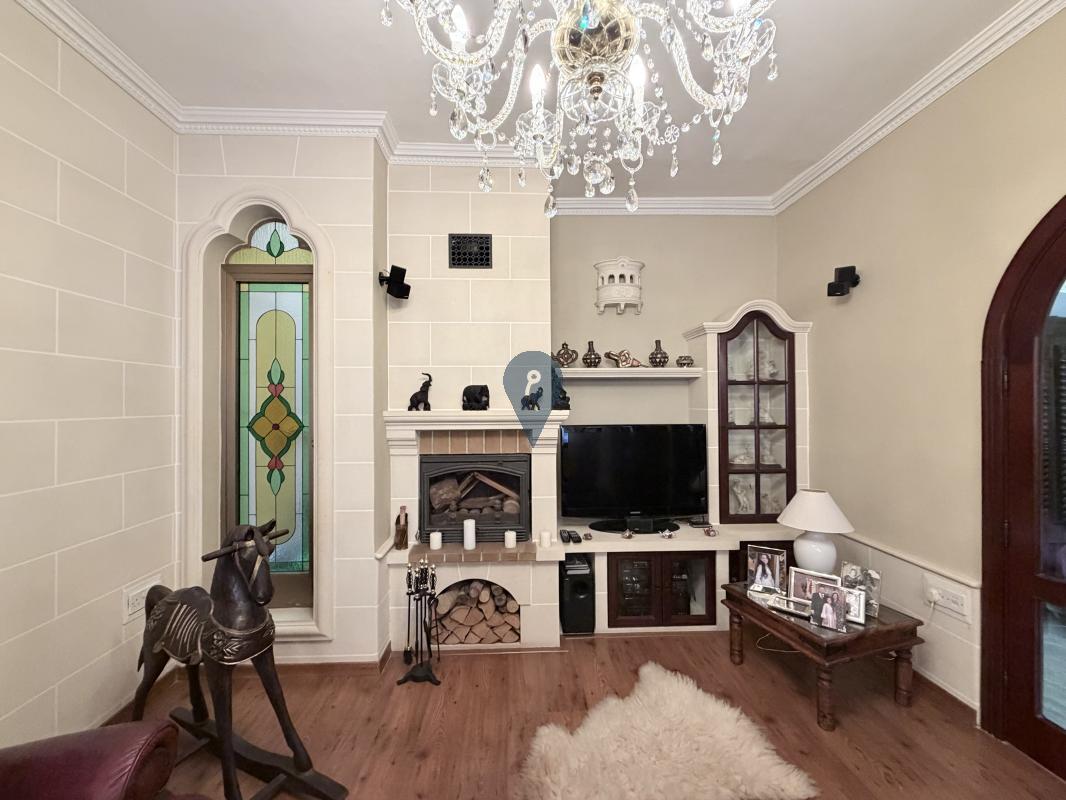 The layout includes a large sitting and living area, a separate kitchen and dining room, and a bathroom on the ground floor. On the first floor, you'll find three bedrooms, a study, another bathroom, and a traditional Maltese balcony.
