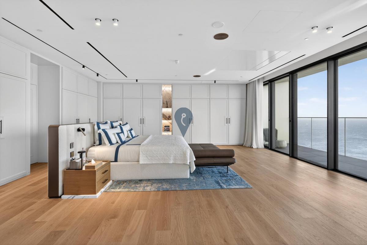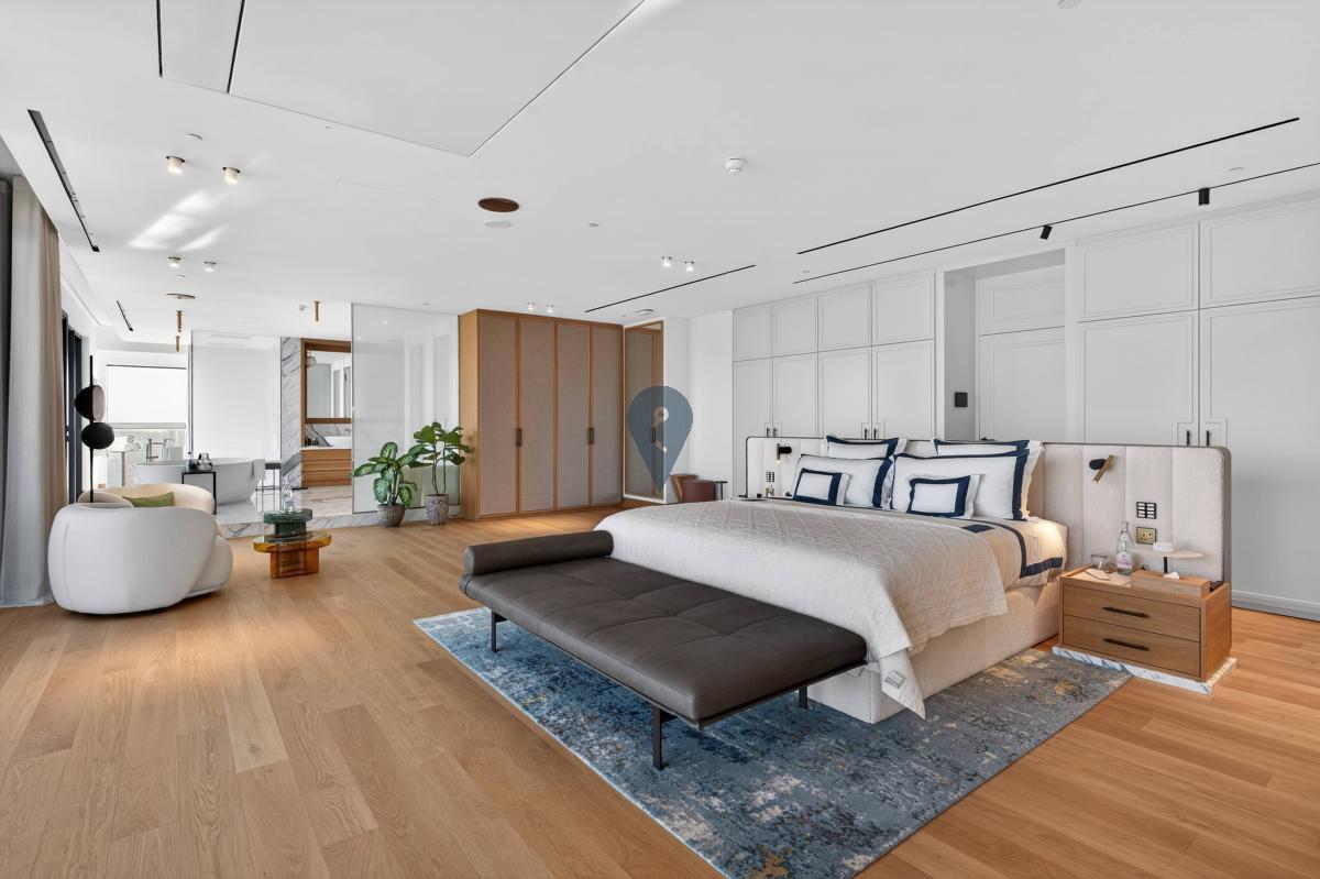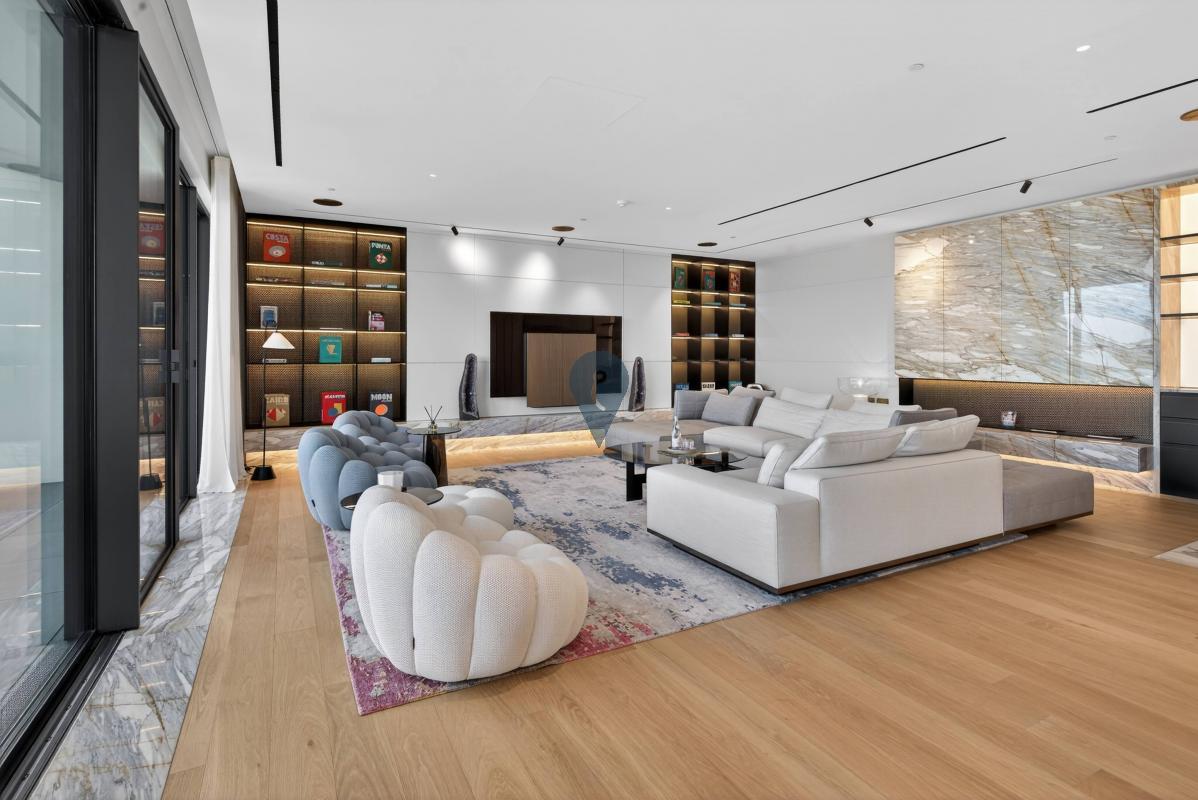 The interiors are executed with quiet precision and permanence. Rich marble, genuine solid wood, and brushed gold accents are layered within a refined contemporary palette, creating an environment defined by confidence and restraint. Continuous floor-to-ceiling glazing dissolves the boundary between architecture and horizon, allowing natural light to move freely across the 912sqm footprint while framing uninterrupted sea and skyline vistas from every principal space.