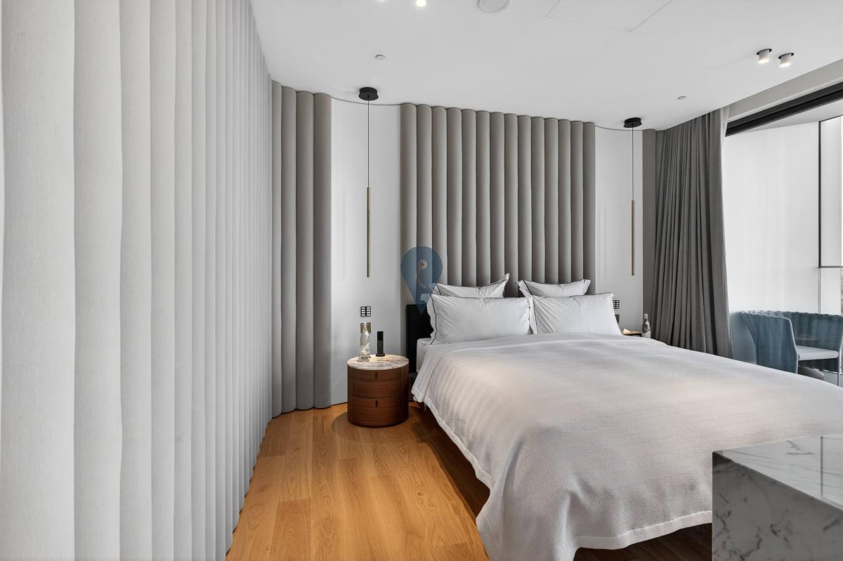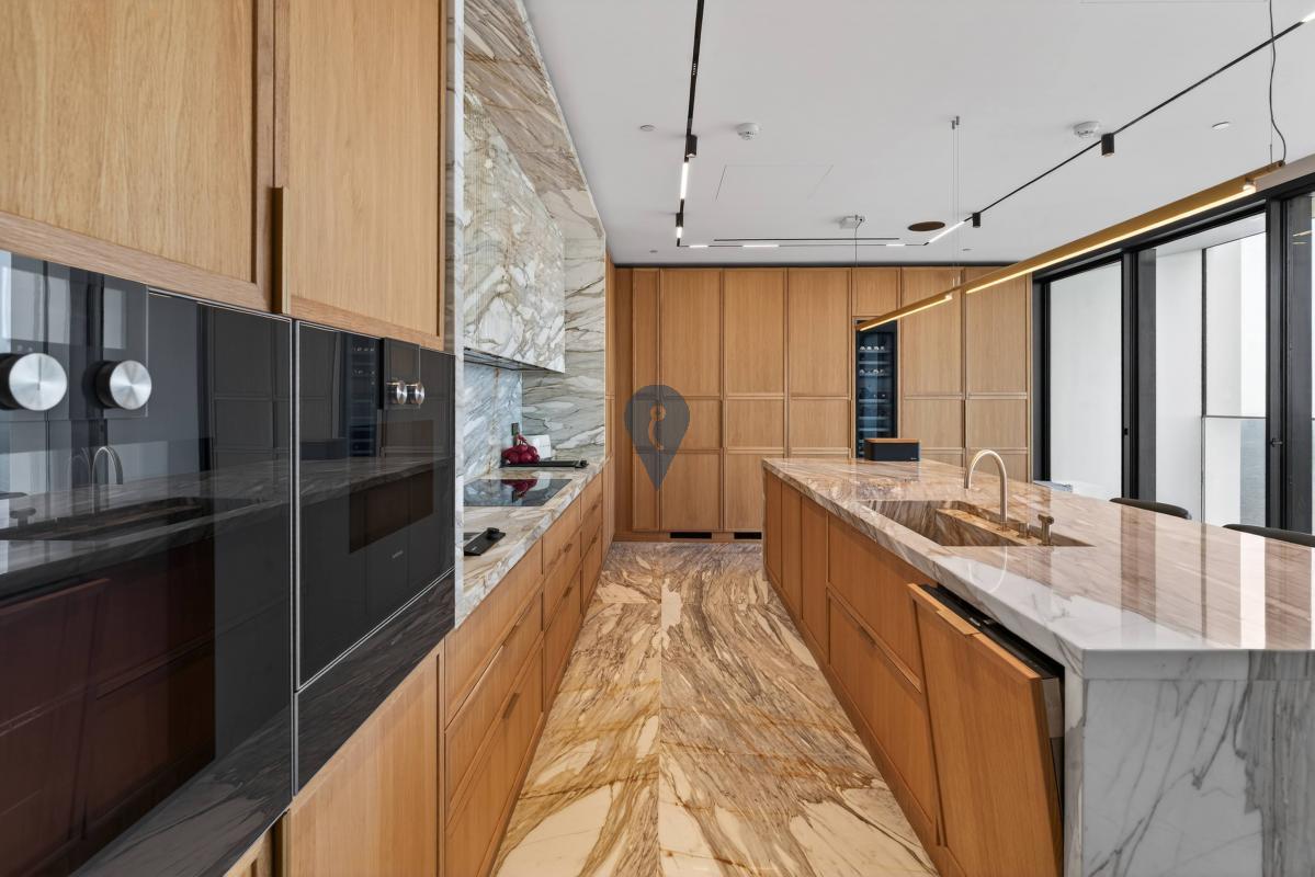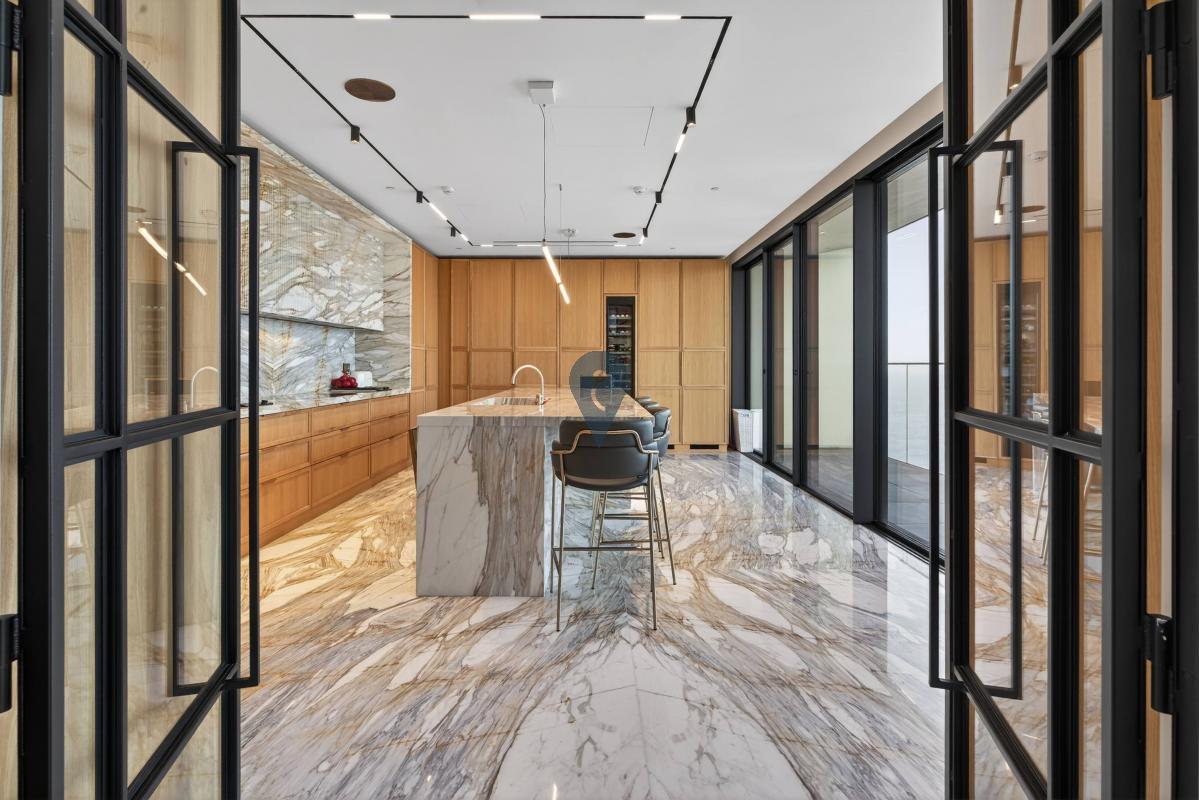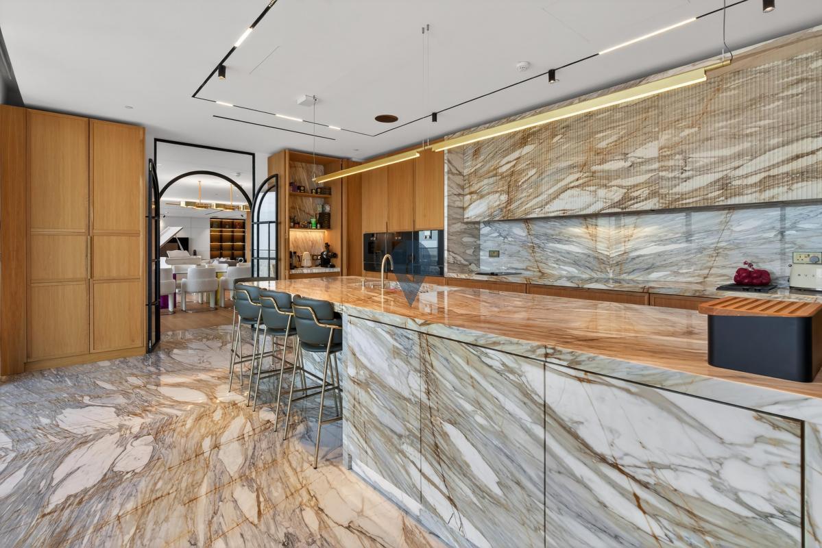 The interiors are executed with quiet precision and permanence. Rich marble, genuine solid wood, and brushed gold accents are layered within a refined contemporary palette, creating an environment defined by confidence and restraint. Continuous floor-to-ceiling glazing dissolves the boundary between architecture and horizon, allowing natural light to move freely across the 912sqm footprint while framing uninterrupted sea and skyline vistas from every principal space.