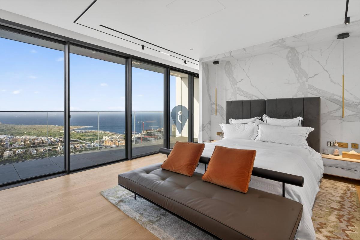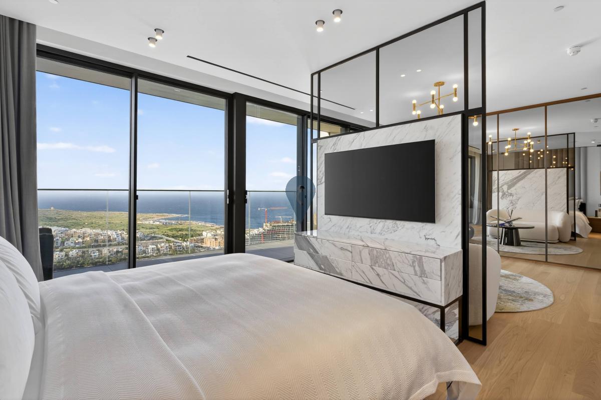 From this commanding elevation, uninterrupted dual-aspect panoramas unfold with cinematic clarity. The historic skyline of Valletta rises with unmistakable presence to the east, while to the west, the open Mediterranean extends endlessly toward Gozo — a rare equilibrium between cultural grandeur and absolute horizon. At this height, the residence exists above the visual plane of the city, immersed in light, silence, and sky.