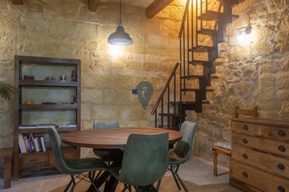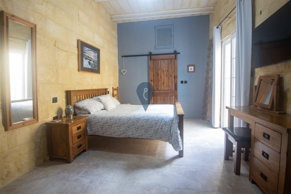 A traditional Maltese staircase leads to the first floor, where three double bedrooms are located. The main bedroom stands out for its generous proportions and features an ensuite bathroom, walk-in wardrobe, and a private internal staircase connecting directly to the ground floor—providing excellent separation and added privacy.