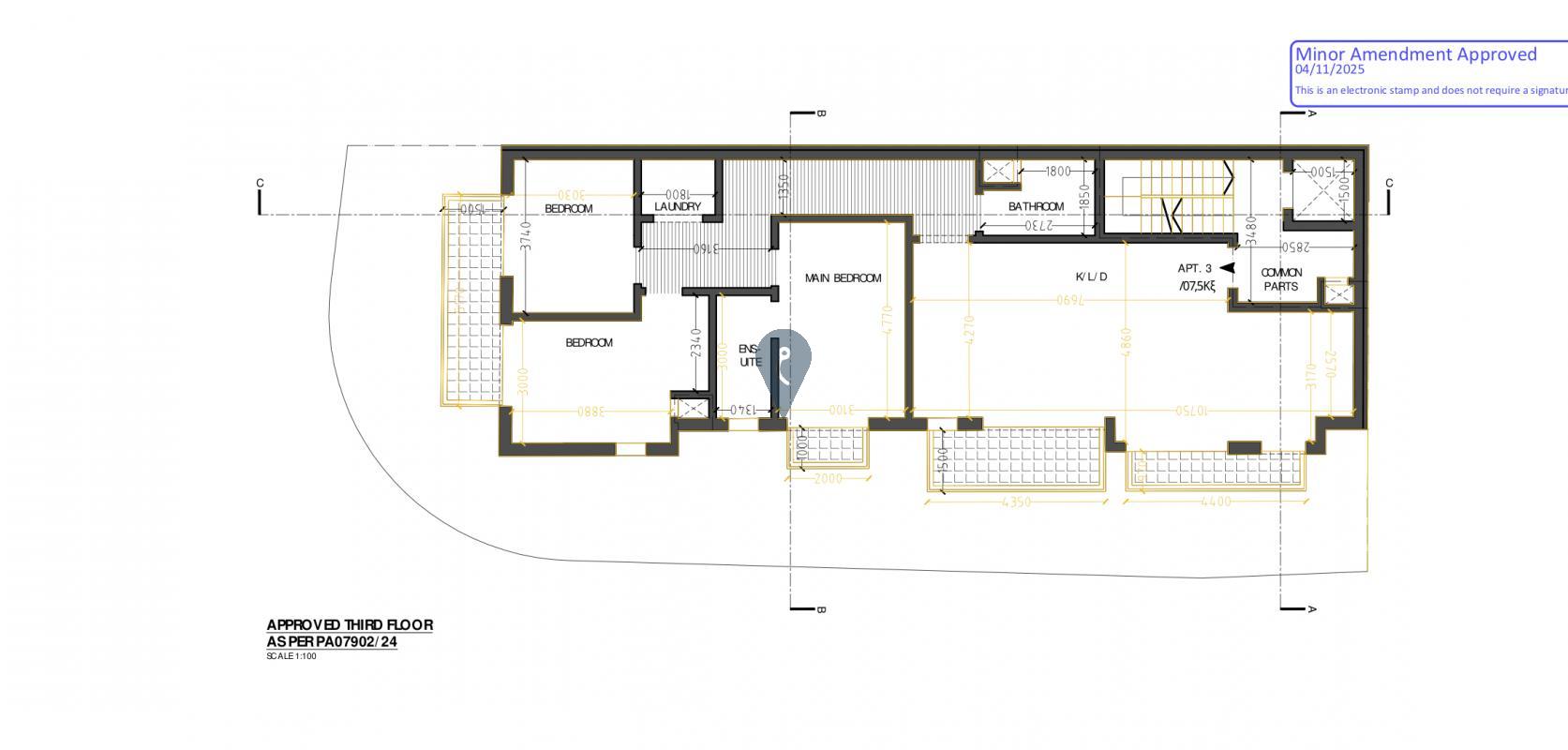 Third floor apartment, layout comprises a large 48sqm open-plan kitchen, living, and dining area leading to a sunny front terrace, a main double bedroom with en-suite shower, two further double bedrooms, a main bathroom, and a laundry room. All bedrooms enjoy their own balcony.