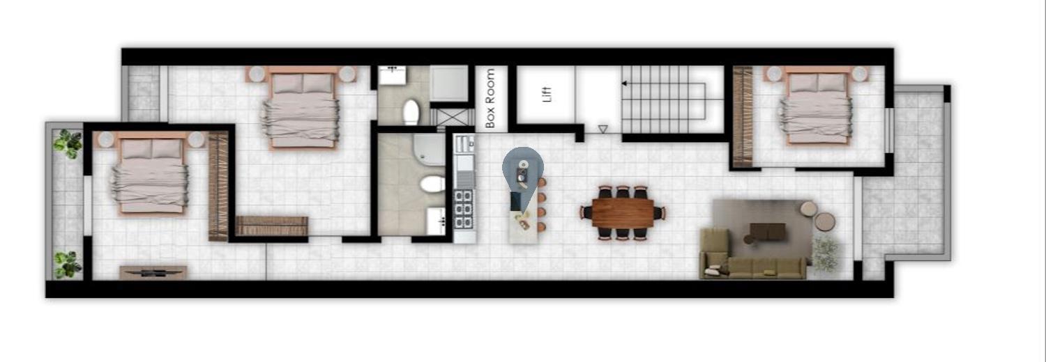 The apartment boasts approximately 120sqm of well-planned internal space, complemented by 13sqm of external areas including a front terrace and a back balcony. The layout is designed to maximize light and functionality, offering a generous living area ideal for both everyday comfort and entertaining.