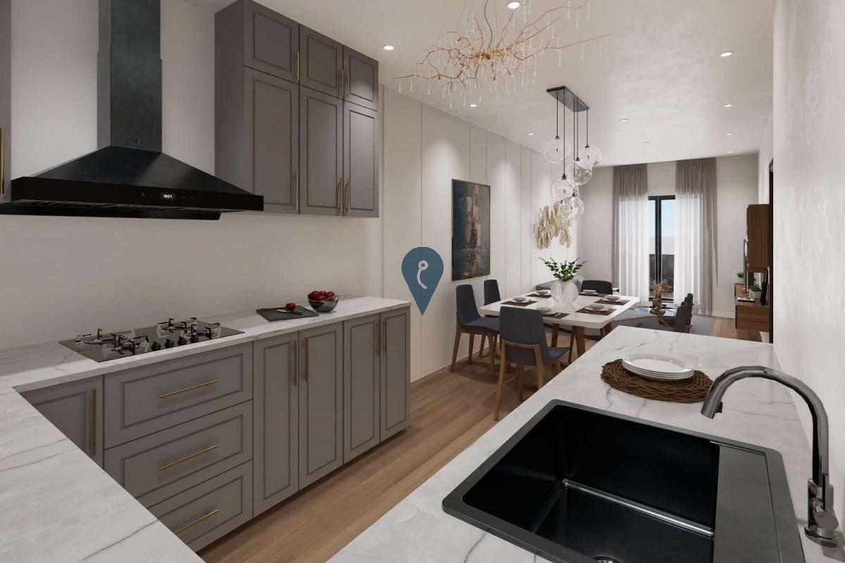 Featuring an open-plan kitchen, living, and dining area, the layout provides a modern and spacious feel.