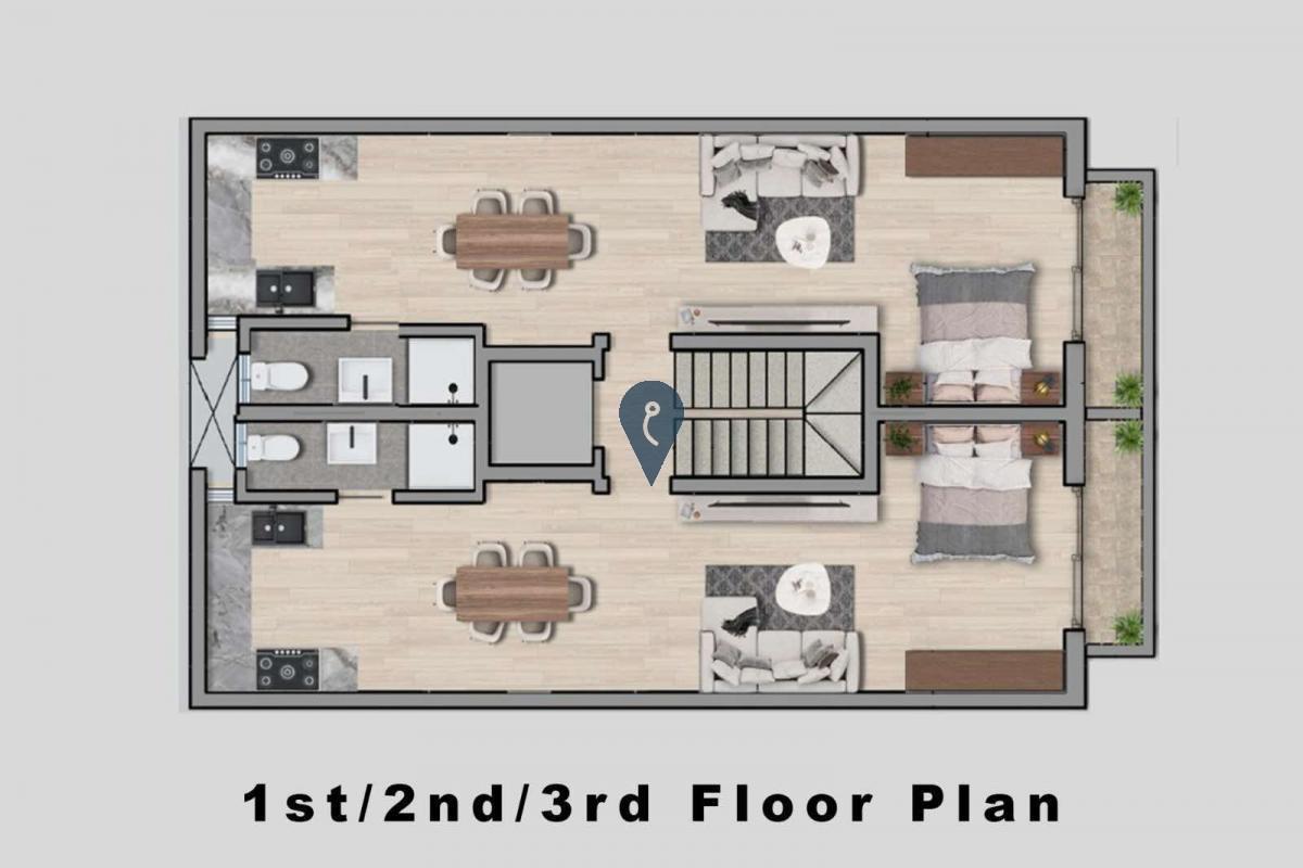 Featuring an open-plan kitchen, living, and dining area, the layout provides a modern and spacious feel.