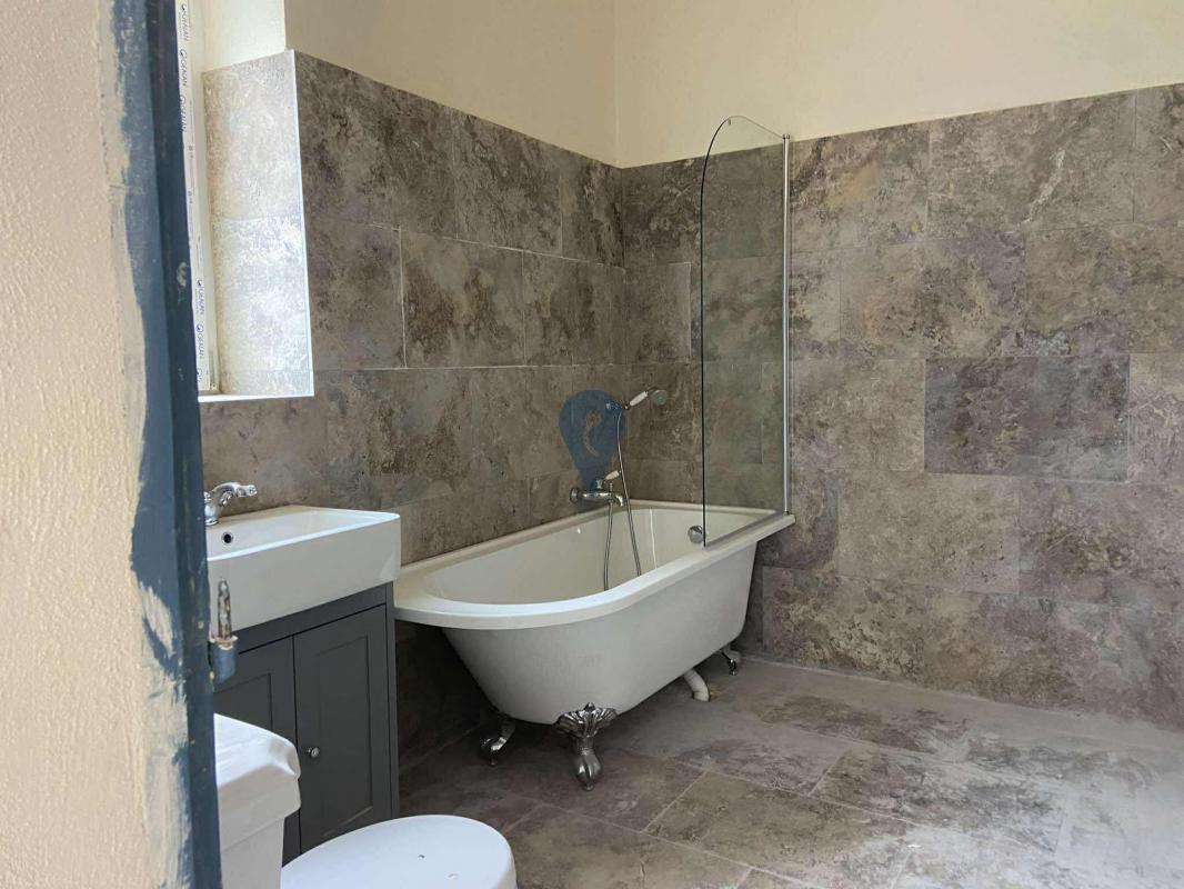 A striking limestone staircase ascends to the first floor, where three elegant bedrooms are found. The master suite benefits from a private en-suite bathroom and walk-in wardrobe, while the remaining bedrooms are served by a well-appointed family bathroom. A generous terrace overlooks the courtyard and garden, providing a peaceful outdoor retreat.