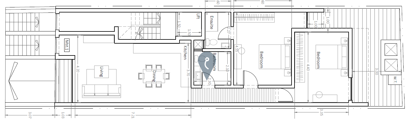 The property comprises a well-designed open-plan kitchen, living, and dining area, creating a comfortable and practical living space. The layout includes two bedrooms, with the main bedroom enjoying ensuite facilities, a main bathroom, and a separate pantry for added storage and convenience.