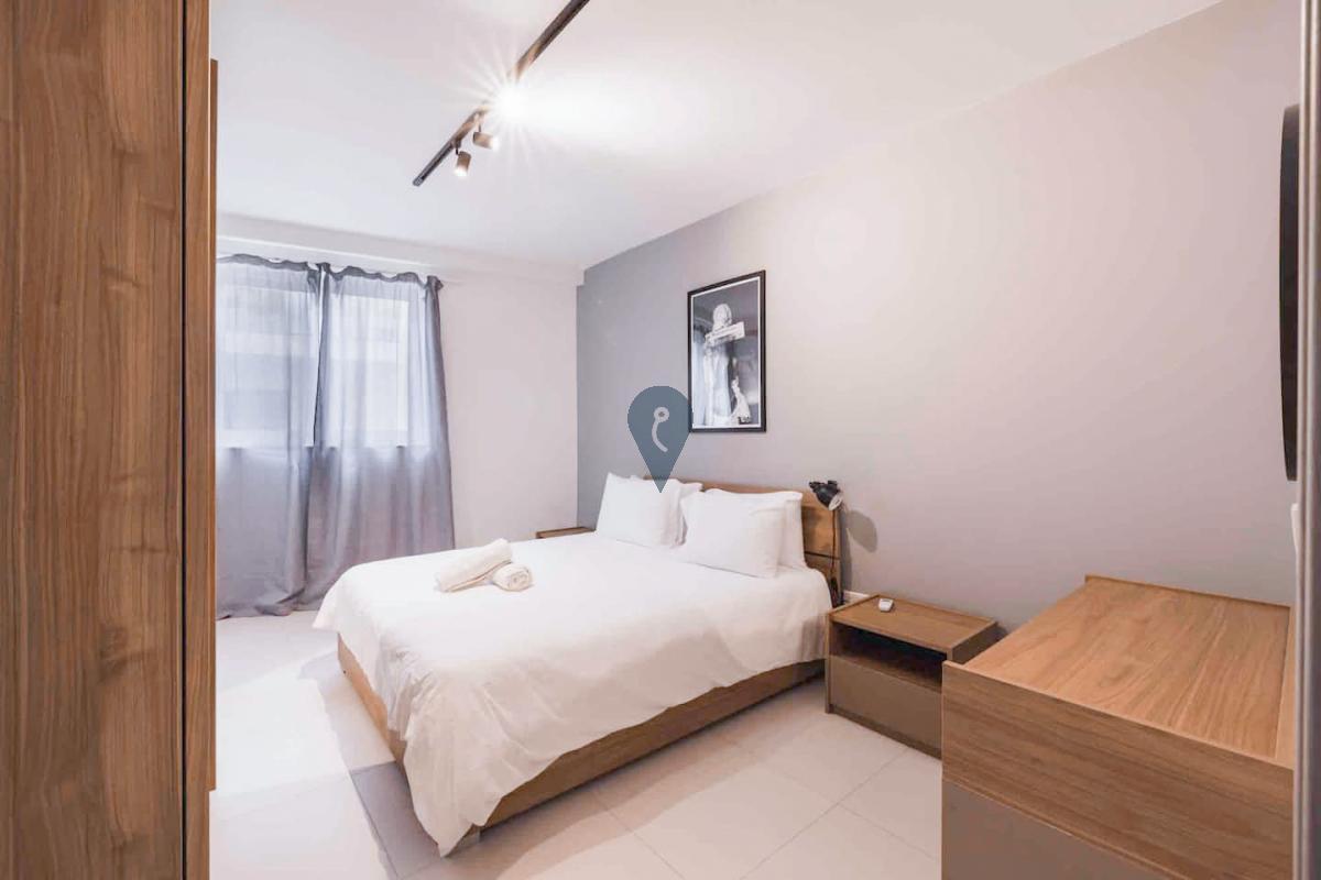 The apartment comprises three double bedrooms, all well-proportioned and tastefully furnished. The main bedroom features an en-suite bathroom, while a second main bathroom serves the rest of the home. The overall layout offers both practicality and a sense of space, complemented by contemporary finishes and stylish furnishings throughout.