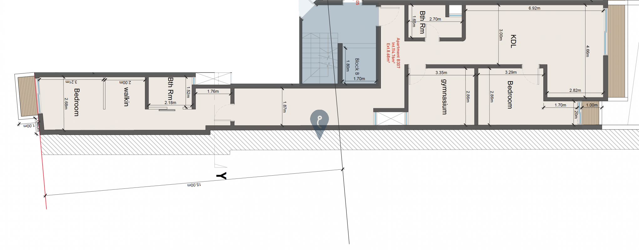 The layout comprises an open-plan kitchen/living/dining area leading onto a front terrace. The apartment also includes a bedroom, study, and bathroom, while on the opposite side of the property, accessible through a corridor, one finds another bedroom and bathroom.