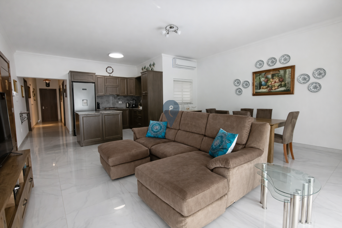 MARSASKALA - A spacious 140sqm furnished first-floor apartment located in a recently built high-end block in Marsaskala, just steps away from the promenade. The property features a bright, open-plan living area leading to a large front terrace, complemented by a back balcony that provides additional outdoor space. It offers three double bedrooms, two bathrooms, and a convenient box room for extra storage. The apartment is fully furnished, air-conditioned, and ready to move into, making it an excellent option for comfortable residential living close to the seafront. Small block of six. Optional Interconnected, basement level, very short ramp, more like semi basement 65sqm four-car garage at an additional cost.