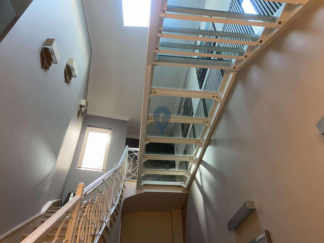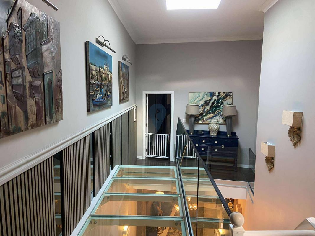 Upstairs, the property offers three generously sized double bedrooms and two well-appointed bathrooms, along with a large washroom for added practicality. A striking glass staircase adds a contemporary designer touch, perfectly blending old and new throughout the home.