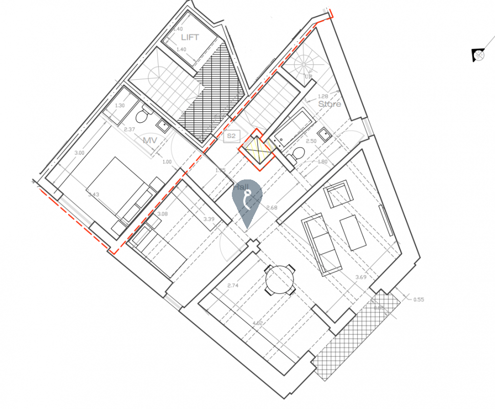 The layout includes an entrance at street level with a staircase leading up to the first floor, with additional access also available from the common area. Upon entry, one finds a hallway leading to a master bedroom with en-suite, a single bedroom, a spacious open-plan kitchen, living, and dining area, a main bathroom, and a store room.